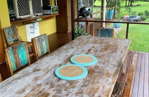 The outdoor seating solid timber table for dinning and comfy layback lounge all set up on the timber verandah with the view totally mountains and rainforest.