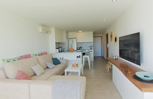 Inside, the apartment boasts a bright and airy open-plan living-dining area with a fully equipped kitchen, illuminated by a large window. It includes a full bathroom with a shower and a bedroom with a double bed, a wardrobe, and a window overlooking the Na Burguesa mountains.