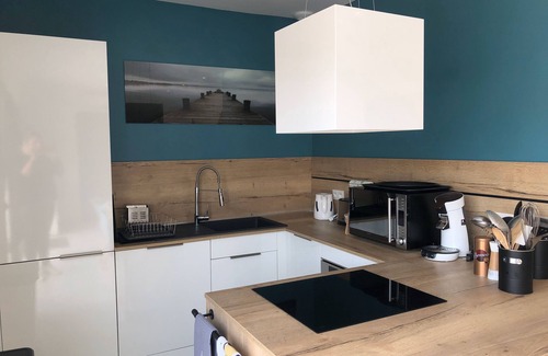 From a main room with a sitting area: sofa with 140 X 190 bed, kitchen units containing all the crockery, flat screen and low sideboard. In addition, the kitchen is fully equipped: freezer-fridge, induction cooker and pyrolysis oven, dishwasher, washing machine, coffee maker, toaster, kettle, etc.