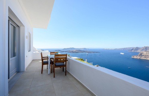Perched on the side of the cliff, these modern, renovated apartments offer a spectacular view of Santorini's caldera.