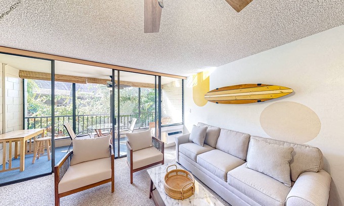 Back at the vacation rental, you'll be greeted by a wonderfully Hawaiian aesthetic with surfboards and interior decor, followed by a kitchen where you'll be able to prepare a meal. Kick up your feet on the couch and relax a bit as you stream your favorite movie /TV show or cast it with AIrPlay if you'd prefer. Head outside and relax your body in the newly renovated pool, and cook up some burgers on the gas grill. Be sure to visit the Courtyard hotel for the luau and experience the magic of Hawaii!