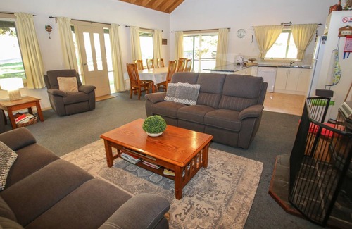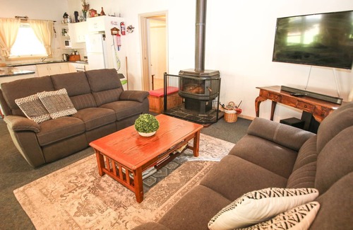 The warm & cosy living area features a smart TV and an enclosed wood fire to relax by. You will enjoy the ambience created by plenty of natural light & vaulted timber ceilings.