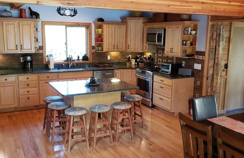 Well-stocked kitchen with all the amenities, kitchen island, granite countertops, dining room table