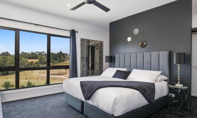 Campania Casa is designed to accommodate adults only. The king size master bedroom features a private ensuite with double vanities, a rain shower, separate toilet, and spacious walk-in robe. The second bedroom has a king size bed, built in robes, and close access to the main bathroom. Each bedroom has ceiling fans, a Smart TV, and amazing views across the garden and surrounding landscape.