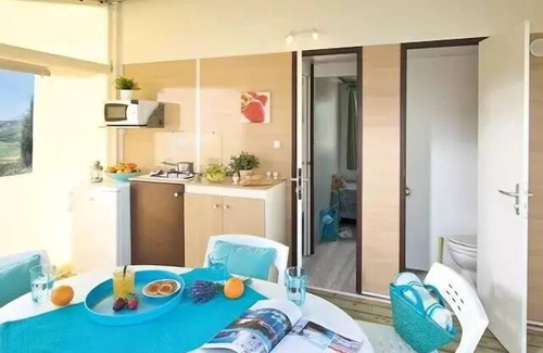 Details: Wi-Fi access : Free access to the terrace Playground for children Family animations Sports animations Final cleaning fee : (optional) €50.00 - to be paid on site Jacuzzi Baby Kit : (cot umbrella and high chair) 10,00€/week - to be paid on site Bedding : 10,00€ - to be paid on site Number of stars : 2 Sin bowling Ping Pong : yes Swimming pool : Outside Near airport : Lyon Saint-Exupéry Airport #LYS (167.2 km), Marseille Provence Airport #MRS (162.6 km) Restaurant : Located 800 meters from the campsite Tourist tax (surcharge) : Current rate - to be paid on site Tennis Pets Allowed : With supplement - Tenus on leash Coffee maker Deposit (in euros) : 200 Number of bedrooms : 2 Number of double bed : 1 Number of single beds : 2 Number of pieces : 3 Number of toilets : 1 Cooking plate Fridge Surface (m²) : 21 Terrace Dishes and cutlery Cooked Microwave oven Barbecue