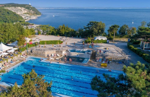 Large, child friendly holiday village "Camping Village Mare Pineta". 115 houses in the resort. 6 apartments in the residence. 1 km from the centre of Sistiana, 18 km from the centre of Trieste, in an elevated position on a slope, 1.6 km from the sea, 1.6 km from the beach. For shared use: property 10 ha (fenced) with trees, swimming pool (30 x 20 m, seasonal availability: 01.Jun. - 30.Sep.). Children's pool, outdoor shower, tennis (extra), table tennis, basketball (extra), beach volleyball, children's playground. In the complex: reception, bistro, shopping facilities, washing machine (for shared use, extra). Grocery 100 m, supermarket 1 km, bus stop 200 m, railway station "Trieste Centrale" 18 km, rocky beach "Baia Sistiana" 1.6 km. Nearby attractions: Castello di Duino 2 km, Castello di Miramare 13 km, Sentiero Rilke 350 m. Please note: entertainment in the season. Suitable for families. Obligation to wear bathing caps. Guests are obligated to wear a wristband in the holiday village. From 14.10.2024-17.04.2025 and 13.10.2025-31.03.2026 only the apartments will be availabe. All the facilites will be closed.
