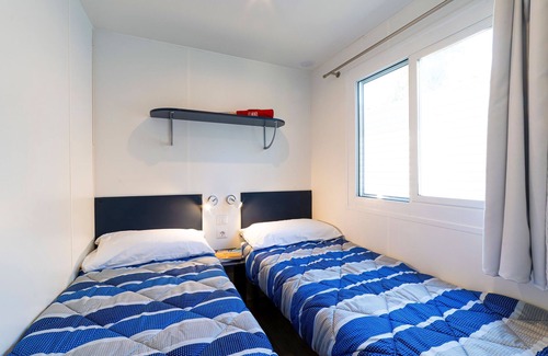 "Baia Sardinia", 4-room mobile home 32 m2. Modern furnishings: living/dining room with dining table and digital TV. 1 room with 1 french bed (140 cm). 2 rooms, each room with 2 beds (70 cm). Kitchenette (4 gas rings, freezer). Shower/WC, sep. WC. Air-conditioning, forced-air heating. Terrace roofed. Terrace furniture. Facilities: mosquito net. Reserved parking (1 car) at the house. Please note: non-smokers only. Maximum 2 small pets/ dogs allowed.