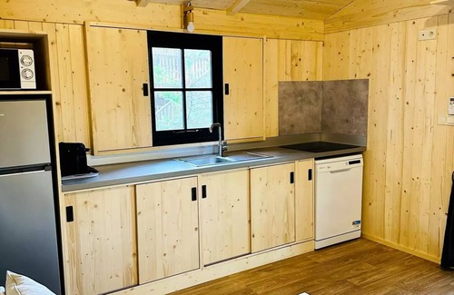 Accommodation: CABANE LODGE PRIVILEGE 2 bedrooms of 27m2 fully equipped + covered terrace of 13m2 with garden furniture overlooking the African Reserve of Sigean to offer you a spectacular view of the animals.Accommodation for up to 5 people (baby included).Our cabins have an equipped kitchen open to the living room, pillows and duvets in the bedrooms, a shower room with sink, a separate toilet.EQUIPMENT: Reversible air conditioning, Dishwasher, Plancha, Microwaves, Fridge with freezer compartment, 4 ceramic glass hob, Toaster, NESPRESO Coffee machine, Kettle.Bedroom 1: 1 double bed 160 x 200Bedroom 2: 2 single beds 80 x 200 + 1 single bed in height 70 x 200 (ideal for children from 6 years)INCLUDING: 1 Free parking space for 1 vehicle in front of the location.Our OPTIONS to customize your stay : End of stay cleaning, Bedding rental, Towel rental, Baby kit, Additional vehicle.Arrival between 4pm and 8pm.Late arrival possible between 20h and 22h to choose as an option when booking. The stay must be fully paid and the deposit deposited online before your arrival to be validated.Mobil-Home NO FUMEUR - Pets NOT AUTHORIZED in this accommodationIllustration images - Non-contractual photos