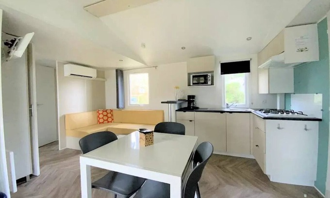 Accommodation: This mobile home has a reversible air conditioning TOP OF GAMME and flat screen TV! It consists of two bedrooms with a double bed 140 x 190 cm and two other bedrooms with 2 single beds 80 x 190 cm in each one of 4 single beds, and a convertible sofa. There are pillows, mattress and duvet protection, a bathroom with shower, washbasin and toilet, a main room with kitchenette and dining area with bench and chairs. Equipped with a flat-screen TV, dishes, kitchenware, microwave, coffee maker, terrace, garden furniture, deckchairs, refrigerator and gas hob.