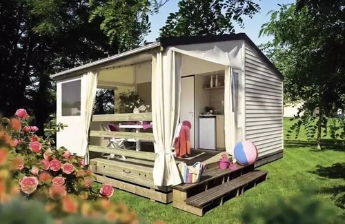 Accommodation: This accommodation is the perfect combination between mobile home and camping tent. This accommodation is without sanitary facilities (no water point, only in the sanitary unit). Sleep in one of the 2 bedrooms of the mobile home, in real cozy beds, and share good family moments in the common room under the roof of the Tit'home. Inside, enjoy an equipped kitchen to enjoy good dishes around a real table. They are equipped with: 2 bedrooms in the mobile home area, 1 kitchenette (hotplates, coffee maker, refrigerator, microwave, dishes) under the roof, 1 dining area (garden table + 4 chairs) under the roof.Consider taking your sheets or renting them when you book.