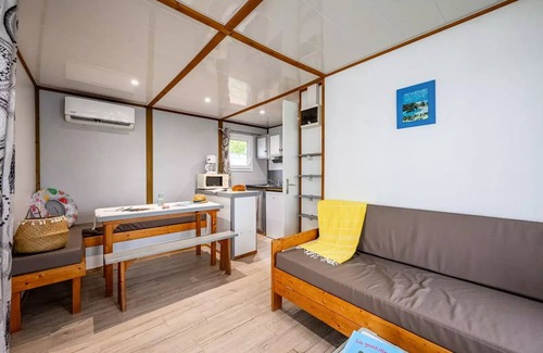 Details: Disabled access Accessible by train : Mauzac (1.7 km), Lalinde (4.8 km) Playground for children : petanque, football, volleyball and basketball fields as well as mini golf, trampoline, swings and slides Family animations : July/August only Sports animations : July/August only Pets allowed : Animals are allowed in the campsite up to 2 per nude location and 1 in the rental, regardless of its size. However, they are not allowed in our mobile homes along the river. Category 1 and 2 dogs are not allowed. Barbecue : Coal barbecues, for 5 € we bring it ready for use (to be reserved at the reception the day before, the price is by use: morning or evening) Deposit (in supplement) : 200 Kids club : Mini Club available in the morning from 4 years Deposit of bread : in July/August, order your bread and pastries for breakfast. Consider booking the day before (extra charge - bar reservation). Grocery store : open all season (check schedules) Wellness area : outdoor fitness area (only in July/August and free access) Baby Kit : (cot + high chair + bathtub), 25 €/week Laundry kit : 12€ double or single bed linen kit upon reservation and subject to availability - to be paid on site Laundromat : washing machine 6 € laundry included - dryer 4 € - to be adjusted on site Mini golf : in high season - free Animation level : 11 Number of stars : 4 Water park : large basin, another basin with water slides and a paddling pool - free access (hours to consult on site) Ping Pong : loan of equipment Swimming pool : large basin, another basin with water slides and a paddling pool - free access (hours to consult on site) Near airport : Bordeaux-Mérignac Airport #BOD (166.9 km), Toulouse-Blagnac Airport #TLS (149.3 km) Close trade : restaurants, bars, pharmacies, doctors, tobacco/press,... 4km Restaurant : all season - Monday to Saturday noon and evening, closing on Sunday Snack bar : July/August Tourist tax (surcharge) : current rate, to be consulted on site Tennis : tennis court (shoes and balls loan) at the exit of the campsite (free). Environmental display Pets Allowed : With supplement - Tenus on leash Barbecue Coffee maker Deposit (in euros) : 200 Air conditioner Freezer Cooked Microwave oven Number of bedrooms : 2 Number of pieces : 3 Number of toilets : 1 Number of bathroom : 1 Cooking plate Fridge Garden Lounge Surface (m²) : 35 Terrace Dishes and cutlery