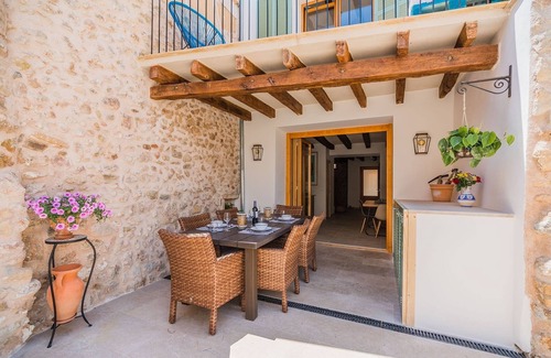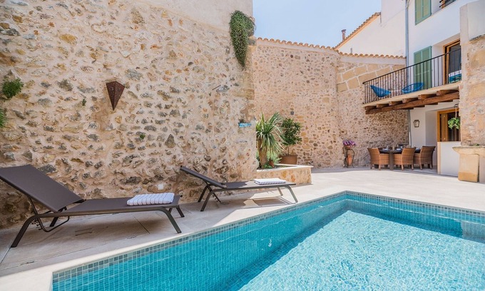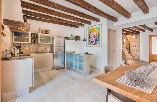 Well-presented newly renovated townhouse - fondly furnished with an eye for detail - located in the heart of the charming old Town of Pollença, with its' historic narrow streets. Can Bons Aires offers spacious 3 bedrooms, two of which have en-suite bathrooms and the third one holds a small bathtub. The house has a nice terrace and a modern patio with plants and space for dining and sunbathing, completed with a BBQ and a shared swimming pool.