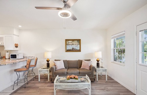 Ideal for your next getaway! The clean, fresh, and comfortable interior ensures a relaxing stay. Enjoy a restful night's sleep on the king-size bed. Additionally, there's a full-size sleeper sofa for added convenience and flexibility. The retreat features a breakfast bar and nook, perfect for enjoying morning coffee or a leisurely meal. Flat-screen televisions in both the living room and bedroom provide entertainment options during your downtime. Experience a touch of nostalgia with the retro original tiled bathroom, complete with a tub/shower. It's a charming nod to the past. This Gulfport retreat is your ticket to a relaxed and enjoyable stay. Whether you're sipping coffee on the porch, exploring the local scene, or lounging on the nearby beach, you're sure to create wonderful memories in this adorable getaway.