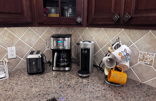 • Dishwasher, stove, microwave, and ample cookware