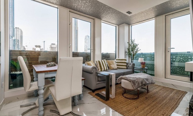 The living room with dual aspect floor-to-ceiling windows is equipped with a luxurious sofa, Voice Control SMART TV with full entertainment including SKY SPORTS + MOVIES / BT SPORTS, Netflix, and a full VIRGIN TV package. There is unlimited superfast 1GB Virgin Fibre Broadband. Additionally, there is a dining table that can seat 4 people and opens onto a balcony with stunning views over London. The kitchen is fully fitted with modern appliances.