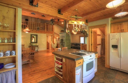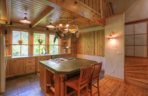 For your safety, along with our normal cleaning we disinfect common surface areas. We also have 100MG Internet service. In the winter we a first priority road for the snow plow and have never had a problem with snow. I also clear the driveway when it snows. No 4x4 needed. Listen to the creek, watch the wildlife and be only a mile from town. This home has Australian Cypress hardwood floors, indoor grill, heated by a Tulikivi (A soapstone fireplace from Finland), and cooled by AC in each bedroom. All electricity is 100% solar. No detail was left out on this unique layout with beautiful natural wood to create a lodge setting in a compact space. The living area is up one flight of stairs. So be aware there are stairs to get to the main level. On the main floor there is one master bedroom with a king sized bed. There are two loft bedrooms accessed by a shipman’s ladder each with a queen sized bed and an additional single trundle bed. There is another raised sleeping area behind Japanese Shoji doors that houses two twin mattresses as well as a carpeted play area. Sleeping for 10 can be easily accommodated in this unique layout. Jacuzzi tub and a home office make this a place to come home and relax after a good day skiing, hiking or biking. The kitchen is fully equipped and the home includes a washer and dryer. Bring a DVD and use our 110 inch Projection screen with surround sound. The canyon road goes for 4-5 more miles and then ends in wilderness area. With the Logan to Jackson bike race and the Top of Utah Marathon both in the valley, this home is passed everyday by athletes who are training in a beautiful setting.