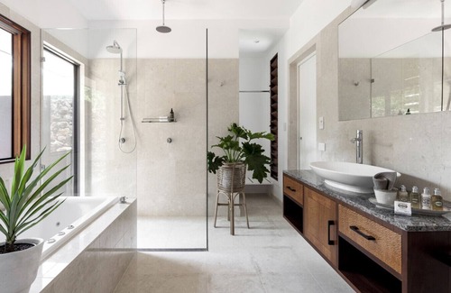 An ensuite bathroom featuring high-quality fixtures and calming tones