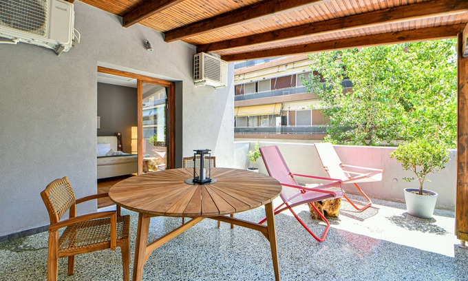 This newly renovated 23 m2 apartment with 31m2 fully furnished balcony can welcome up to 2 guests. The apartment can offer a relaxing sleep in the sunny bedroom with a queen-sized bed and accommodate 2 more guests in the bed mattresses embedded in the sofa bed inside the living room. The stylish private bathroom is perfect for a refreshing shower. The kitchen is fully equipped for a local taste experience, containing a mini-fridge, freezer, oven, cooktops, microwave, cooking equipment, toaster, coffee machine and a kettle. There is also a 48” TV with free Netflix and 2 air-condition units. The building has also a common washing machine, a dryer and high speed WiFi.