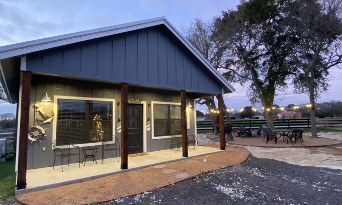 A unique Get Away with Family and Friends. Close to A & M, Round Top, and several Local Wineries. Rent one cabin on this property or several. Each Cabin has its own outdoor space and charcoal grill. This cabin has a tranquil outdoor area sharing a firepit with the cabin next door. Your dogs are welcome. There is a fenced in yard with this Cabin.