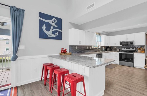 The open living area is bright and welcoming, with red and blue nautical accents and high ceilings that make you feel instantly at the beach. Flat-screen TVs in the living room and bedrooms mean movie nights are always an option. An elevator makes coming and going a breeze!