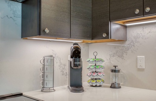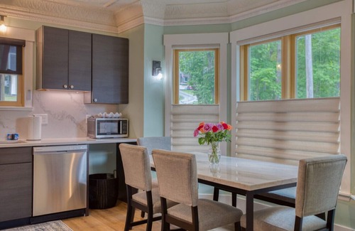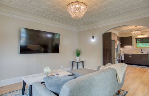 Stepping into Captains Quarters, you'll be greeted by a bright and airy open concept living area. Adorned with crystal chandeliers and beautiful pressed metal ceilings from the original construction. The completely renovated kitchen is well appointed and ready for whipping up delicious meals. The dining area is neatly tucked into a bay style window allowing lots of natural light in to enjoy meals by or to play games. Relax in the spacious living room with a 75” smart TV that will provide a great space to unwind after a day or roaming.