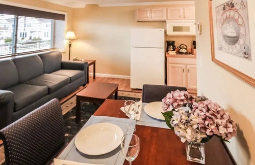 Stay comfortably in Falmouth at this 1-bedroom efficiency hotel suite. This property features a king bed in the bedroom, ensuring a pleasant and restful stay for guests. The bathroom offers a hair dryer and a relaxing jetted bathtub. In addition to the comfortable bedroom, there is an inviting living room with a sofa bed for extra space. Take advantage of amenities like an outdoor pool, efficiency kitchen, outdoor BBQ area, WiFi, a coin laundry, TV, coffee maker, onsite parking and AC. Check in 5 pm; checkout 10 am. No pets or smoking allowed. Children allowed 0-17. Experience what Falmouth has to offer and stay at the Captain's Quarters Inn on Grand Ave in Falmouth Heights.