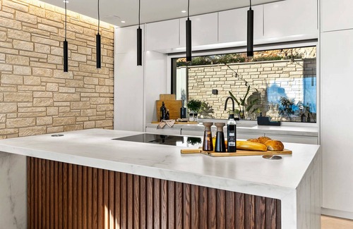 Moving inside, the villa interior is a masterpiece, crafted with meticulous attention to detail and premium materials radiating a distinct aura of grandeur and comfort with an open-plan design that encompasses a large comfortable lounge adorned with huge sofas, a 77″ flat-screen TV and a feature log burner, please note, the log burner is for decorative purposes only and not available for guest use. The dining area features a bespoke built table and stylish chairs for memorable meals with family and friends. Floor-to-ceiling sliding glass doors showcase the breath-taking coastline views ensuring abundant natural light and facilitating seamless indoor-outdoor connectivity. The gourmet kitchen is a chef’s delight, equipped with state-of-the-art appliances, including a full-size integrated fridge, full-size integrated freezer, two dishwashers, wine fridge, washing machine, oven/microwave combi and an induction hob with a built-in extractor laid into a waterfall-edge island. Both the indoor and outdoor kitchens are meticulously provisioned, sparing you the need to transport items back and forth.
