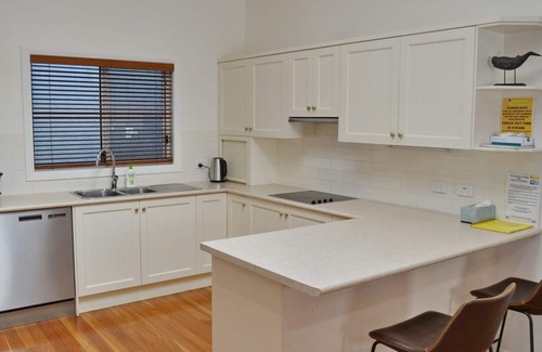 The spacious lounge invites you to relax on the plush sofa or in a cozy chair while enjoying your favorite shows on the large Foxtel-equipped TV. A modern, fully equipped kitchen with high-quality appliances makes cooking effortless. Ducted air conditioning, ceiling fans, and refreshing sea breezes ensure comfort year-round.