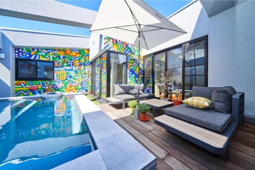 Providing an outdoor swimming pool and free Wifi, Carabao Apartment provides accommodations in the center of Kyoto. With pool views, this accommodation offers a terrace. Kyoto Shigaku Kaikan Conference Hall is 1.5 miles from the apartment and Kitano Tenmangu Shrine is 1.8 miles away. The air-conditioned apartment consists of 2 bedrooms, a living room, a fully equipped kitchen with a microwave and a coffee machine, and 3 bathrooms with a shower. A private entrance leads guests into the apartment, where they can enjoy some fruit. The daily breakfast offers buffet, à la carte, or continental options. There is an on-site bar. Nijo Castle is a 7-minute walk from the apartment, while Kyoto International Manga Museum is 0.9 miles away. The nearest airport is Itami Airport, 29 miles from Carabao Apartment.