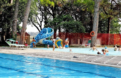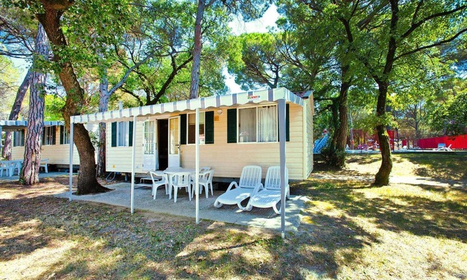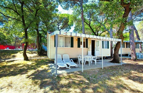 Great location: caravan park in the wooded area of a fifty hectare natural park on the Grado lagoon. Each of the practically furnished mobile homes has its own parking space. Young and old can refresh themselves in the 300 square meter pool, with the water slide providing the fun factor. If you prefer to swim in the sea, you can easily reach the lagoon's flat sandy beach via a pedestrian crossing. Depending on the location of your accommodation, the beach is between three hundred and five hundred meters away. There is a separate section of beach for dogs and their owners. The approximately 500,000 square meter natural park borders directly on the gently sloping sandy beach (reserved exclusively for park guests) and is only five kilometers from Grado's old town. You can easily reach the lagoon city by car via a causeway. Countless shops, restaurants and bars await you in the beautiful pedestrian zone. The following applies to the system: - 185 residential units - Reception - Restaurant - Pizzeria - Supermarket - Bar - Washing machine (for a fee) - Tumble dryer (for a fee) Activities nearby: A well-signposted cycle path runs directly past the complex, so you can explore your surroundings from a different perspective at a slower pace. Nearby is the famous archaeological site of Aquileia, which you should definitely visit. The place was one of the most important cities of the Roman Empire and is one of the largest archaeological sites in Italy. Amateur ornithologists get their money's worth in the Valle Cavanata and Foci dell'Isonzo nature reserves. A day trip to nearby Venice is also possible; it's best to take the train there; You can reach the lagoon city in about an hour and a half and have no parking problems. Other destinations for day trips are Trieste, Udine, Pordenone, Cividale and Gorizia Mobility: Not suitable for people with a