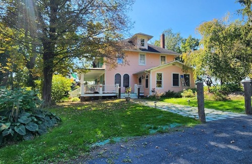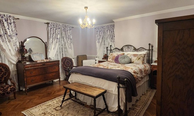 Overlooking the falls and front lawn and gardens, this subtle lilac oasis with possible adjoining suite (the Sparrow) will enchant you with a sumptuously comfortable Serta Perfect Sleeper Hybrid queen size bed, vintage furnishings, organic cotton bed and bath linens - and robes. Private large luxury bathroom with soaking tub featuring all-natural, cruelty free and carbon-neutral Plaine Products accessible via your own key just outside the door.