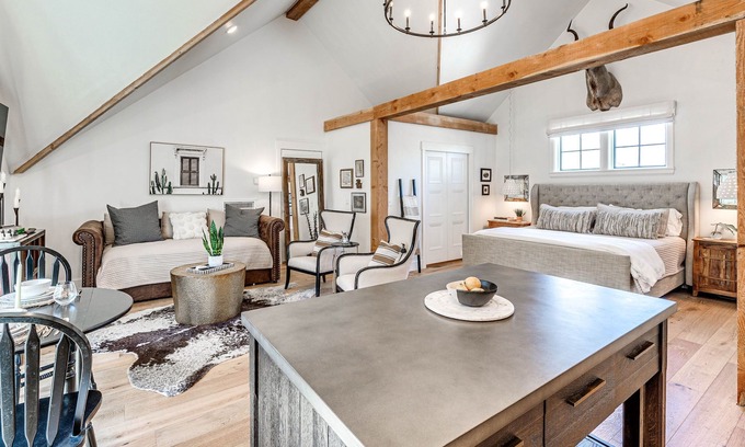 This charming studio loft offers a spacious king bed and a pullout twin day bed-perfect for a couple, but can also accommodate a family of 4. With a fully equipped kitchen, including a dishwasher, and a washer/dryer, all the conveniences of home are at your fingertips. The open layout and eclectic furnishings create a welcoming atmosphere.
