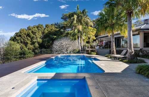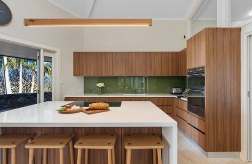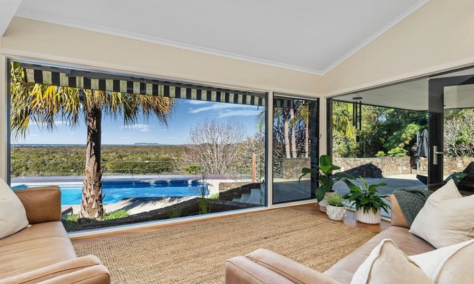 The residence features four spacious bedrooms, including a master suite with a private outdoor bathroom, offering a tranquil sanctuary with stunning views. The separate self-contained studio provides an ideal space for guests or teens, complete with an en-suite, television, and direct access to the outdoors. The property offers a total of 5 bedrooms. The open-plan living areas are designed for comfort and style, featuring high raked ceilings, exposed stone feature walls, and air-conditioning throughout. The modern chef’s kitchen is equipped with Smeg appliances, a large butler's pantry, and an island benchtop, making it perfect for entertaining family and friends.