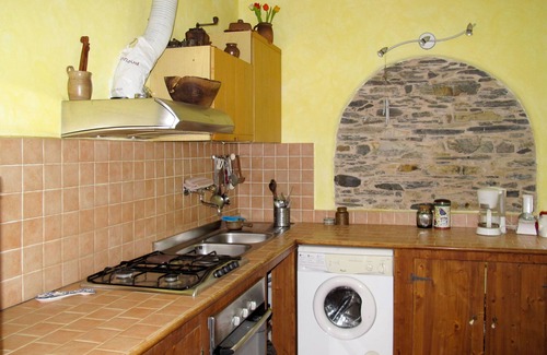 "Carpe Diem", 3-room house 70 m2. Rustic furnishings: living/sleeping room with 1 sofabed (140 cm), dining table, TV and DVD. 1 room with 1 double bed (160 cm). 1 room with 1 x 2 bunk beds (80 cm). Exit to the balcony. Open kitchen (1 hot plate, oven, 3 gas rings, toaster, kettle, freezer, electric coffee machine) with open-hearth fireplace. Bath/bidet/WC. No heating option. Balcony, terrace, patio. Terrace furniture, deck chairs (6). Beautiful distant view of the mountains and the valley. Facilities: washing machine, iron. Internet (WiFi, free). Maximum 3 pets/ dogs allowed.