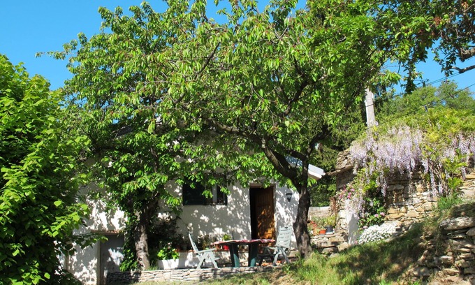Small, rustic cottage "Carpe Diem", surrounded by trees and meadows. In the hamlet Guardiabella 6 km from the centre of Aurigo, 12 km from the centre of Pieve di Teco, 24 km from the centre of Imperia, in a secluded position on a slope, 30 km from the sea, in the countryside. Private: natural state property 1'000 m2, garden (not fenced) with wildlife garden and trees, meadow. Garden furniture. 250 m long narrow motor access. Parking (for 2 cars) on the premises. Shop 6 km, supermarket 12 km, restaurant 450 m, bus stop 6.2 km, railway station "Imperia" 30 km, pebble beach "Imperia" 30 km. Walking paths from the house 100 m.