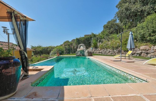 A new air-conditioned house and a private heated pool with a view to the blue water of the Mediterranean. The place is located on a quiet and secured domain, midway between Nice and Cannes (5 miles from Antibes and 3 miles from the beach). Only 10 minutes drive to the motorway A-8 guarantees a perfect holiday in the south of France. There is one huge living room of 80 square yards with a high ceiling of 6 yards. There are 3 double bedrooms all facing sea and sun.The sun invites itself into the three double bedrooms every morning, so all the guests are waking up early for a swim in their private pool. There are two balconies and a garden of 1500 square yards to relax and dine.