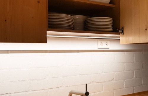 It compreende the large living space with a lovely dining area and a well equipped kitchen. In the living area there is a couch with a single bed underneath, very handy for a small family of three people. The single bed can be pulled out for the evening and slide back underneath the couch in the morning, leaving the area nice and tidy for the day. Upstairs in the mezzanine there is a good size double bedroom with a comfortable king size bed (1.80 X 2.0 m). Downstairs there is a bathroom with window and a large shower base with glass doors.