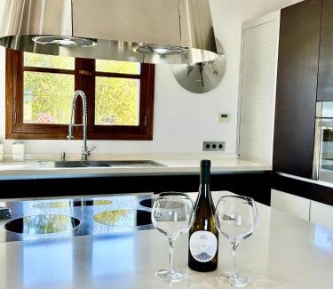 InternetInternet facilities, Wireless internetBathroomBathtub, Towels, Toilet, Hairdryer, Shower, Private bathroom, Bathtub or showerMedia & TechnologyTV, Flat-screen TVGeneralHardwood or parquet floors, Iron, Air conditioning, Private entrance, Ironing facilities, Trash cans, Heating, Fire extinguisher, Tile/Marble floorActivitiesHot tubOutdoorsBarbecue, Private pool, Terrace, Balcony, Outdoor furniture, Outdoor dining area, PatioKitchenHigh chair, Kitchen, Dishwasher, Oven, Kitchenware, Coffee machine, Wine glasses, Dryer, Washing machine, Toaster, Microwave, Dining table, Refrigerator, Cleaning productsLiving AreaDining area, Desk, Sitting area, Fireplace, SofaViewPool view, Landmark view, View, Mountain view, Garden viewBedroomLinens, Childrens' cribs, Wardrobe or closetAccessibilityUpper floors accessible by stairs onlyBuilding CharacteristicsDetachedRoom AmenitiesDrying rack for clothingPool and SpaPool with a view, Pool towels, Shallow end |