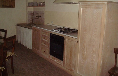 The living room is paved with Tuscan terracotta tiles. The ceiling has characteristic exposed wood beams. The furnishings are rural and characteristic of the Tuscan house. The furnishings include a sofa and an armchair. There is a big and age-old fireplace. In the living room you will also find a cooking area. The kitchenette is equipped with a four-burner gas cooker, an electric oven, a refrigerator with freezer, a dishwasher, an Italian-style coffee-maker and an American-style coffee-maker (bring your filters!). The dining table can accommodate nine guests. In this room you will find a television (local channels). The room has a double-glazed window with a view of the countryside.