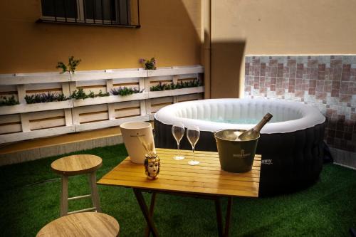 BathroomTowels, Shampoo, Bathtub or shower, Towels/Sheets (extra fee), Toilet paper, Body soap, Free toiletries, Hairdryer, Private bathroom, Toilet, Shower, BidetMedia & TechnologyStreaming service (like Netflix), TV, Flat-screen TVGeneralAir conditioning, Private entrance, Carbon monoxide sources, Heating, Fire extinguisher, Trash cans, Carbon monoxide detector, Iron, Key access, Smoke AlarmActivitiesHot tubKitchenKitchen, Wine glasses, Oven, Cleaning products, Kitchenware, Coffee machine, Stovetop, Kitchenette, Washing machine, High chair, Dining table, RefrigeratorLiving AreaSofa, Dining area, Sitting areaOutdoorsPatio, Outdoor dining area, Outdoor furnitureBedroomLinens, Wardrobe or closet, Childrens' cribsAccessibilityEntire unit located on ground floorBuilding CharacteristicsSemi-detachedRoom AmenitiesSofa bed, Drying rack for clothing, Non-feather pillow, Socket near the bedViewInner courtyard viewPhysical distancingSingle-room AC for guest accommodation |