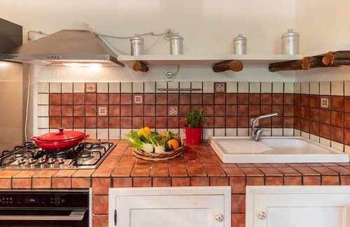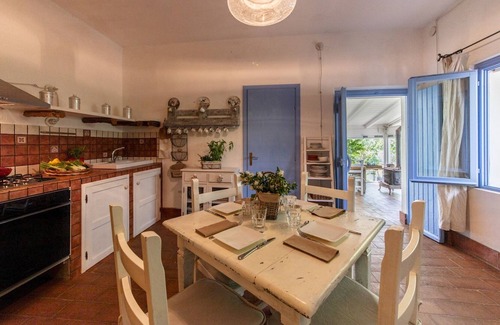 Casa Alice, with its 1000 sq m of enclosed garden, is immersed in a beautiful enchanted atmosphere in the quiet of the countryside; a well-kept lawn with fruit trees such as lemons, apricots and medlars while beautiful native holm oaks, olive trees and bushes of broom provide precious areas of shade; in the front part of the garden, facing the beautiful living area enclosed by folding glass doors, is a built-in barbecue, a wood-burning oven, a large bamboo sofa with cushions and a small decorative arch with climbing vines that contains a small table and two chairs. From this area it is possible to reach the swimming pool and the solarium. At the entrance is a large parking area in gravel with a wooden pergola.Please notice that photos are taken in spring, therefore flower blossoming, and the colours of the gardens' grass could be different at the moment of your arrival at the villa.