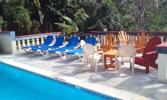 Enjoying the pool cooking with the propane barbq many chairs or long chairs to enjoy or the tranquility of the place.