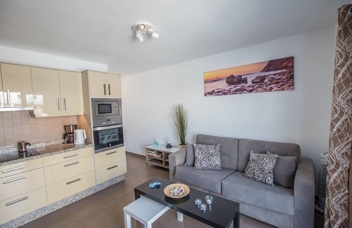 The apartment has an open plan kitchen and living room. The living area has wifi, flat screen TV with channels in various languages and a spacious terrace overlooking the pool area. From the terrace one can also enjoy the ocean views whilst having a cup of tea or a glass of Malvasia wine.
