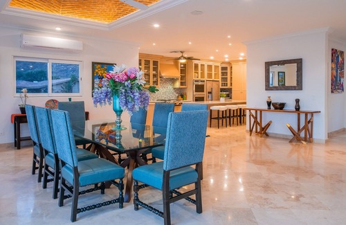 Enjoy beautiful ocean views from your terrace featuring a pool, jacuzzi , gas BBQ, outdoor fireplace, and a palapa. Inside, the villa is attractively decorated with vibrant artwork, marble floors, granite counters, and lovely bedroom suites with private bathrooms and comfortable furnishings. Enjoy the ample open living area with retractable glass doors extending to an ocean-view terrace.