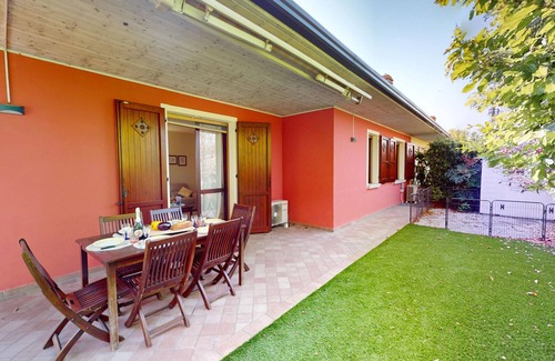 Casa Arcoiris offers a welcoming and functional stay experience, ideal for families, couples and business travelers looking for comfort and tranquility. Located in Manerba del Garda, this property is located in a natural environment surrounded by woods, ensuring privacy and serenity.The house has three bedrooms, carefully furnished with two double beds and a single bed, able to comfortably accommodate up to 5 people. The rooms are equipped with air conditioning in the living room and in the sleeping area, while electric heating ensures optimal comfort throughout the year.The house boasts two bathrooms, one with a shower and one with a bathtub, offering flexibility and comfort for guests. The independent kitchen is fully equipped with quality appliances, including a refrigerator, freezer, dishwasher, oven, coffee machine and numerous kitchen utensils that make preparing meals a pleasure.The outdoor areas are particularly well-kept, with a fenced garden of 150 square meters of synthetic grass and furnished with garden furniture, perfect for moments of relaxation outdoors. The property is pet-friendly, allowing up to two pets, and has two private parking spaces outside.Additional features include WiFi, a children's area, smoke detectors, a fire extinguisher and a cozy living area. Its strategic position allows you to easily reach the sandy beach “La Romantica” just 3 km away and a Eurospin supermarket 1 km away.An ideal accommodation for those who want to spend holidays in comfort, nature and tranquility, with all the necessary services at hand.