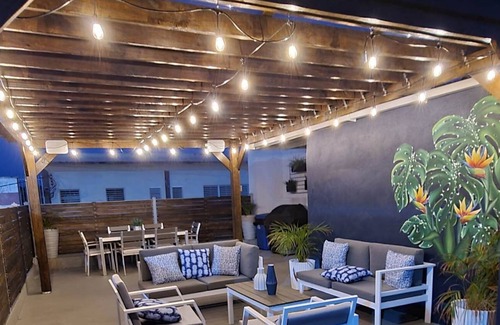 Un lugar acogedor ubicado en eun segundo nivel con espacio para 6 personas en donde pueden tener la experiencia de una estadía única y diferente. El lugar cuenta con una amplia sala, cable tv, wifi, cocina, área de juegos que incluye billar, mesa "air hockey", gimnasio, 1 cama king, 2 literal full size, 1 sofá cama full, A/C en todas las áreas, 2 baños completos, terraza exterior con jacuzzi y sillas para tomar el sol. Contamos con Café 368 en los predios del edificio donde puedes disfrutar de un delicioso café, desayunos y "brunch".