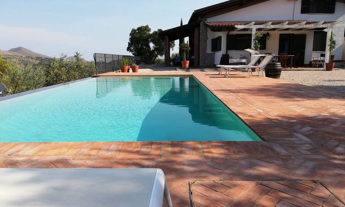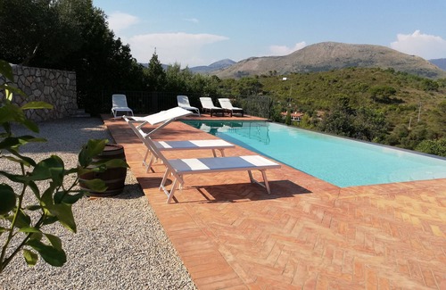 Large villa suitable for outdoor living in contact with nature with large outdoor spaces. House Equipment: wood heating, central heating, air conditioning, washing machine (private use). Private parking inside the property, totally fenced with electric driveway gate. Accessible by car all year round. Car recommended. Situation: on the outskirts between Sperlonga and Itri, quiet, sunny position in the countryside. The house overlooks the garden and the valley. Surroundings of the house: land (for private use, 2'500 m2, fenced), swimming pool for private use "mt9x4 hmax 1.80 ad infinity, overlooking the surrounding countryside full of olive groves and Mediterranean vegetation, purified with salt system, with hydromassage corner with 6 jets, outdoor shower (for private use), barbecue (for private use), fireplace (for private use). outdoor dining. Infrastructures and distances: shop 2.5 km, supermarket 2.5 km, restaurant 750 m, sandy beach 11 km, riding stables 22 km, metro / train 6 km. Please note, nearby: a railway line 6 km and a Rome airport - 120 km away and a Naples airport 90 km away.