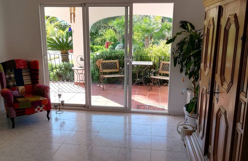 The large pool with its inviting terrace is available to all guests, as well as the large, beautifully landscaped garden with sculptures, pond, fountain u. Rest places invite you to relax. In about 6 - 8 km away there are two golf courses. A shopping mall (Portal de las Marinas) can be reached in about 8 km.