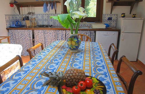 The house has a spacious dining room with an open kitchen, 3 double bedrooms and 2 bathrooms. It also has all modern amenities, such as a satellite TV, air conditioning, dishwasher, Wi-Fi, and a washing machine (free shared use). In front of the house there is a large covered porch with a seating area, a table with wooden chairs and a built-in barbecue. It is an ideal place to enjoy a meal or a glass of wine. The swimming pool, shared with the other guests staying in the complex, is in front of Casa Basiluzzo.