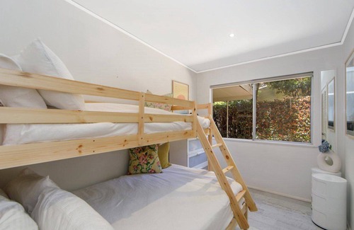 Quiet, serene, and magical Pearl Beach is the perfect destination for guests wanting a relaxing holiday within easy reach of Sydney. The beach is only a 4-minute walk. The cafe, restaurant, tennis courts, kids' playground, arboretum, and incredible bush walks are also close by. Just a 10-minute drive to the town centre of Umina and Ettalong Beach there is plenty of activities for the family to enjoy. This 2-bedroom house with cabin has everything to suit any family with the spectacular pool and manicured gardens offering a relaxing setting. Main bedroom has a queen bed and cot the second bedroom has a tri bunk, while the cabin has 2 single beds, and a bunk bed.